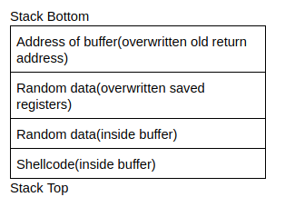 - Start out by entering the shellcode in the buffer, entering random data between the shellcode and the return address, and the address of the buffer in the return address