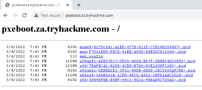The second piece of information you would have received was the names of the BCD files. These files store the information relevant to PXE Boots for the different types of architecture. To retrieve this information, you will need to connect to this website: http://pxeboot.za.tryhackme.com. It will list various BCD files: