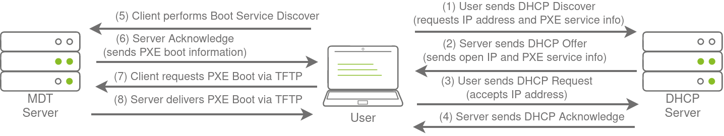 Large organisations use PXE boot to allow new devices that are connected to the network to load and install the OS directly over a network connection. MDT can be used to create, manage, and host PXE boot images. PXE boot is usually integrated with DHCP, which means that if DHCP assigns an IP lease, the host is allowed to request the PXE boot image and start the network OS installation process. The communication flow is shown in the diagram below: